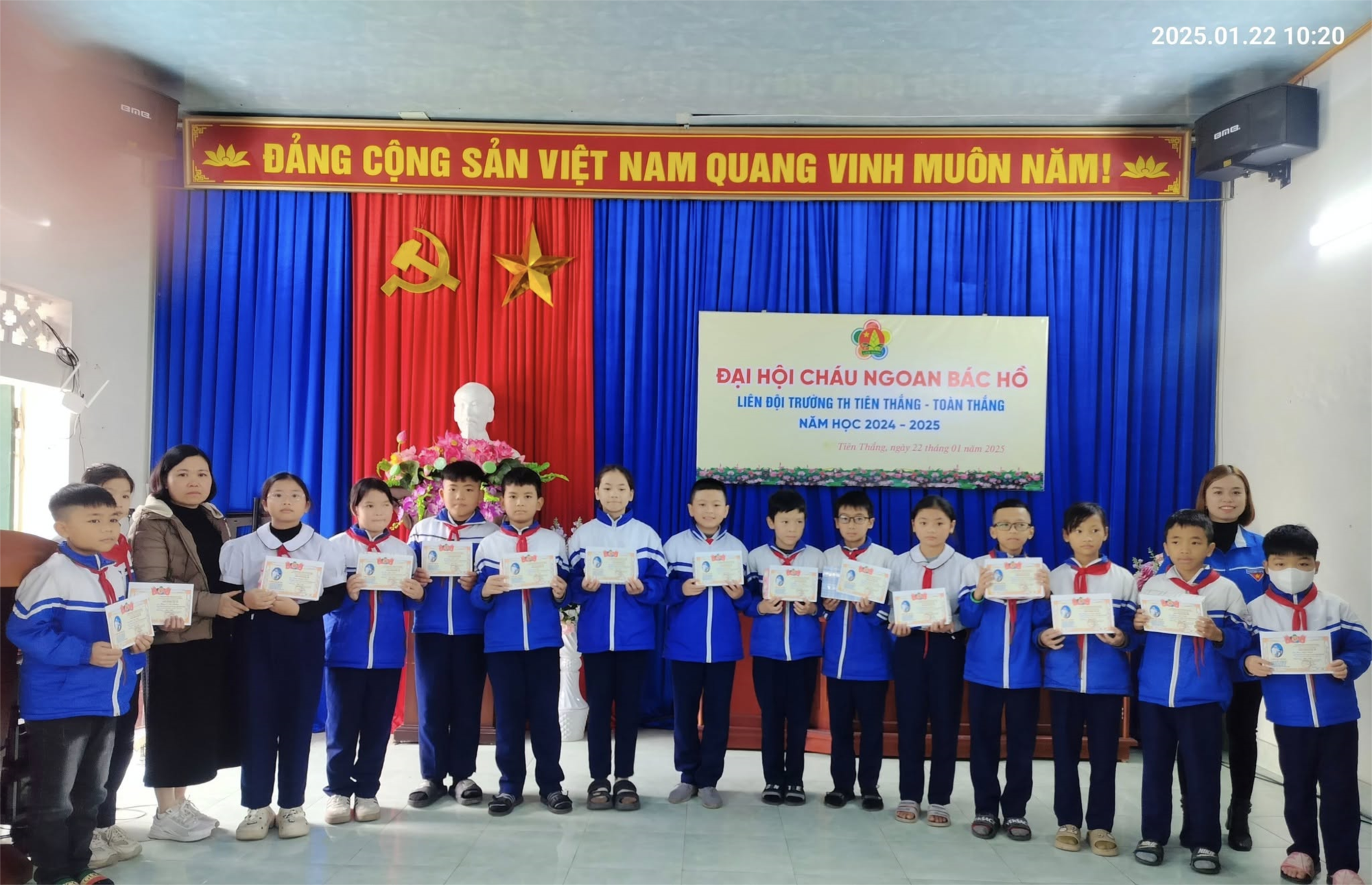 Sáng ngày 22/01/2025, Liên đội Trường Tiểu học Toàn Thắng - Tiên Thắng đã tổ chức Đại hội Cháu ngoan Bác Hồ năm học 2024 - 2025, hướng tới Đại hội Cháu ngoan Bác Hồ huyện Tiên Lãng lần thứ XIV năm 2025. Tại đại hội, nhà trường đã trao giấy chứng nhận danh hiệu Cháu ngoan Bác Hồ cho 50 đội viên và nhi đồng có thành tích xuất sắc trong học tập và rèn luyện. Trong năm học vừa qua, Liên đội đã triển khai nhiều phong trào ý nghĩa như hành trình về nguồn, tặng quà cho học sinh nghèo vượt khó, và phong trào "Nói lời hay - Làm nghìn việc tốt", góp phần nâng cao chất lượng giáo dục và tinh thần đoàn kết trong học sinh.